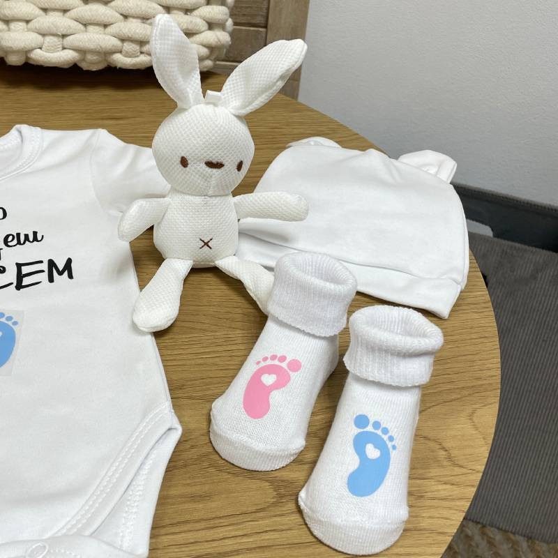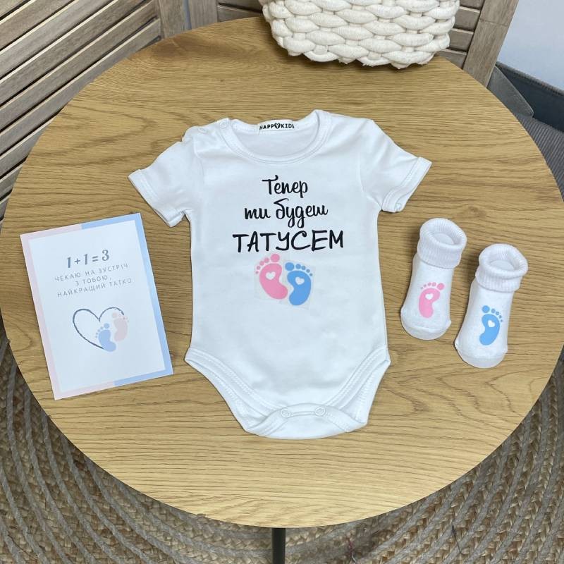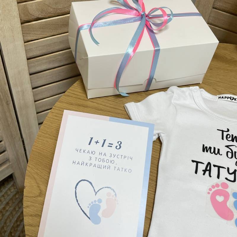 В подарунковій коробці: боді з написом "Тепер ти будеш татусем", шкарпетки, іграшка зайчик, картка з повідомленням.