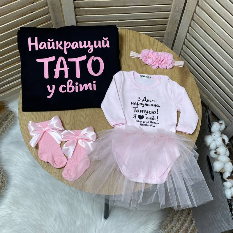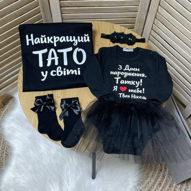 Зробіть святковий день вашої родини незабутнім з нашим ексклюзивним набором для привітання! Цей чудовий комплект включає в себе милу боді-сукню для вашої маленької принцеси та стильну футболку для тата, які разом створюють ідеальне поєднання для святкування дня народження.