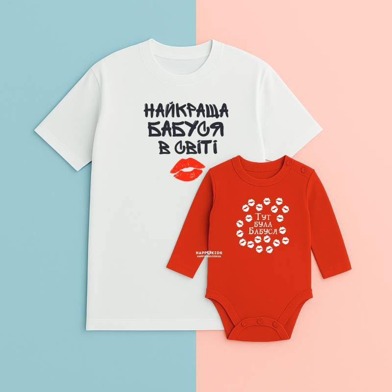 Зворушливий подарунок, що об'єднує покоління! Набір включає жіночу футболку для бабусі з написом "Найкраща бабуся в світі" та миле боді для малюка з поцілунками на написом "Тут була бабуся". Такий комплект створено для теплих моментів, сімейних фото і щирих обіймів.