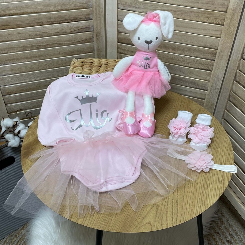 Набір включає в себе: боді зі спідничкою, пов'язку з квіткою на голівку, шкарпетки з квіткою та зайку з іменем вашої дитини.
