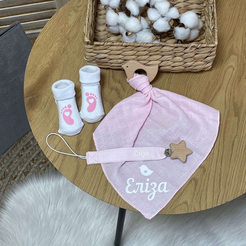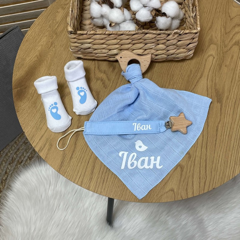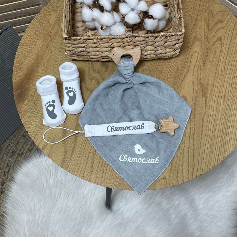 В комплекті: носочки, іменний тримач та хустинка з гризунцем.