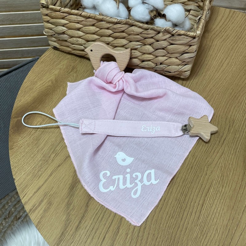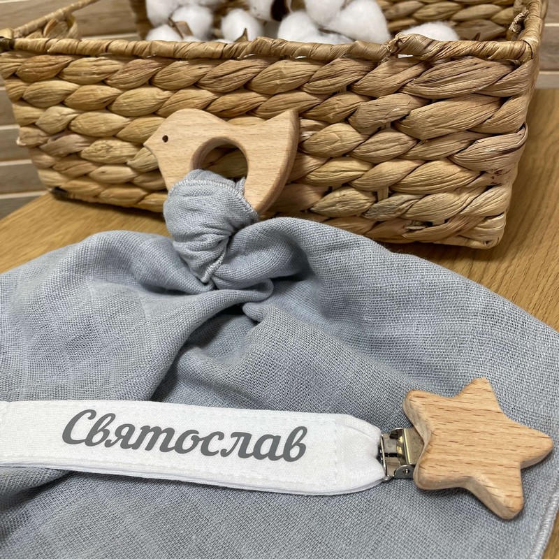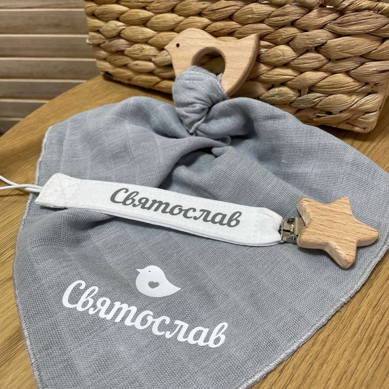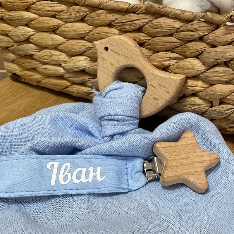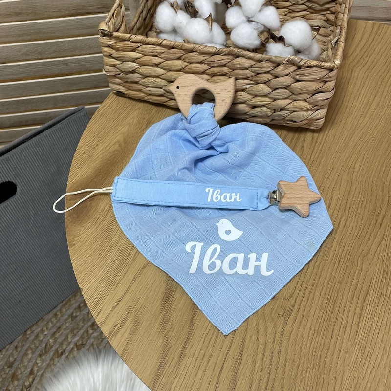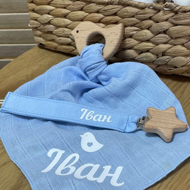 Гризунець та іменний тримач виконаний з безпечного дерев'яного гризунця в формы пташечки, що допоможе зняти біль при вирізуванні зубів. Дитина зможе безпечно гризти його, не травмуючи ясені та зубки. Іменна хустинка,що не подразнює ніжну шкіру дитини та допомагає доглядати за дитиною. Нею можна витирати лице дитини від слини та забруднень.