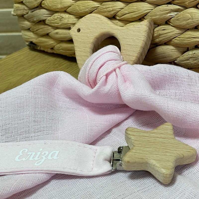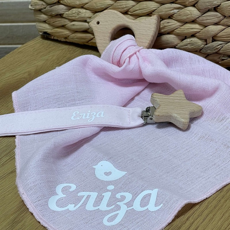 Гризунець може бути персоналізований з іменем вашої дитини, що робить його чудовим подарунком на народження або хрестини. Крім того, в комплекті з гризунцем йде дерев'яна пташка з хусткою муслін, яка може бути використана як додатковий гризунець або як звичайна іграшка.