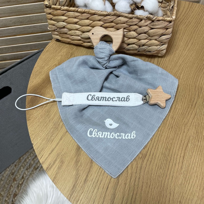 В комплекті іменний тримач та хустинка з гризунцем.