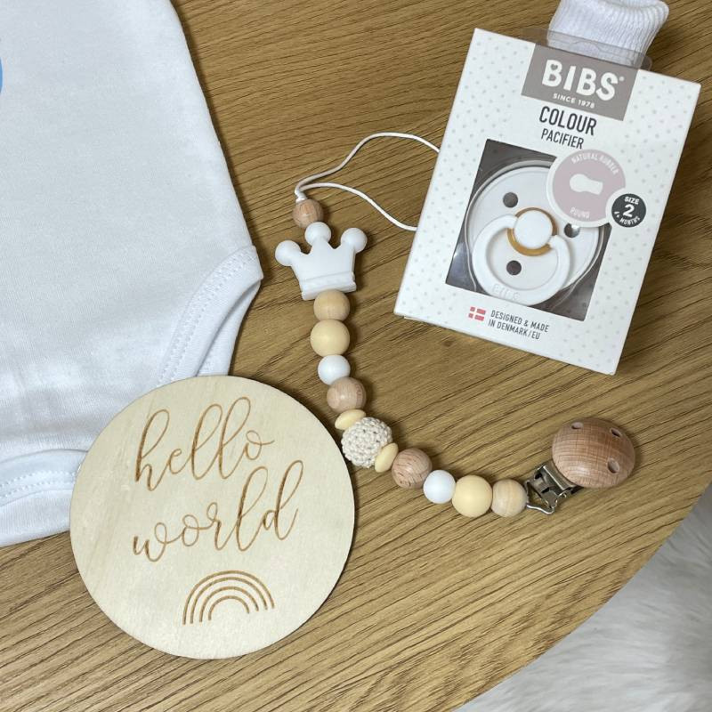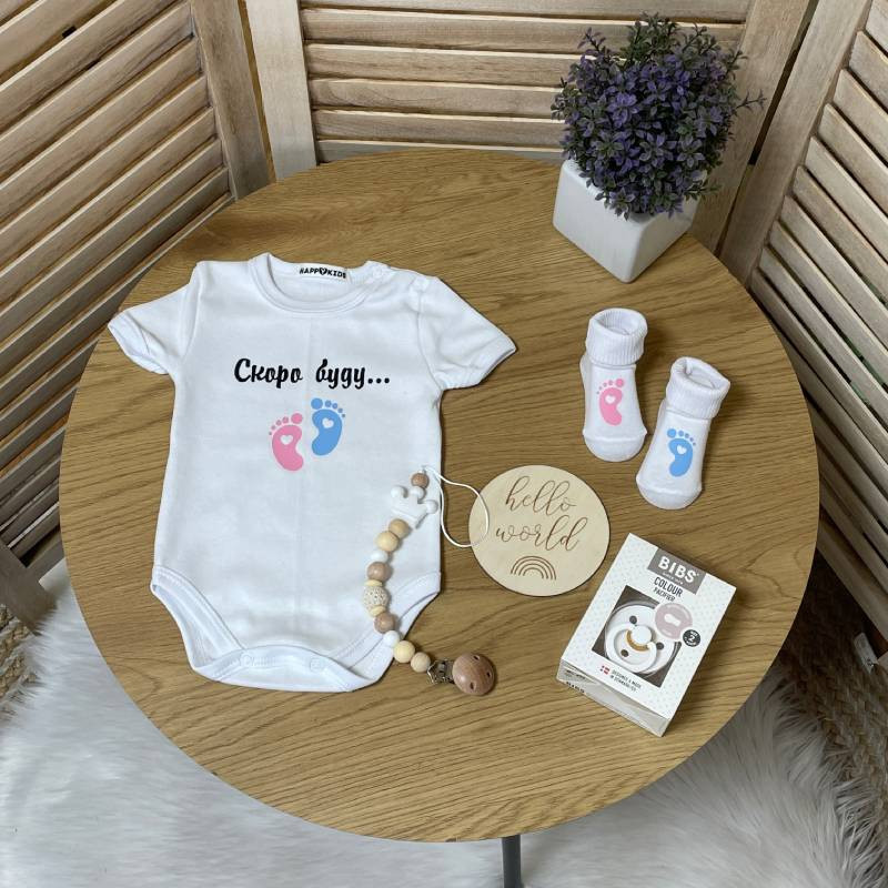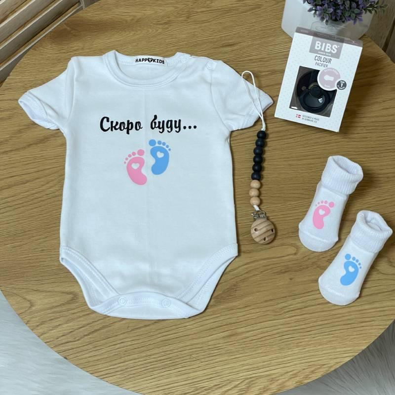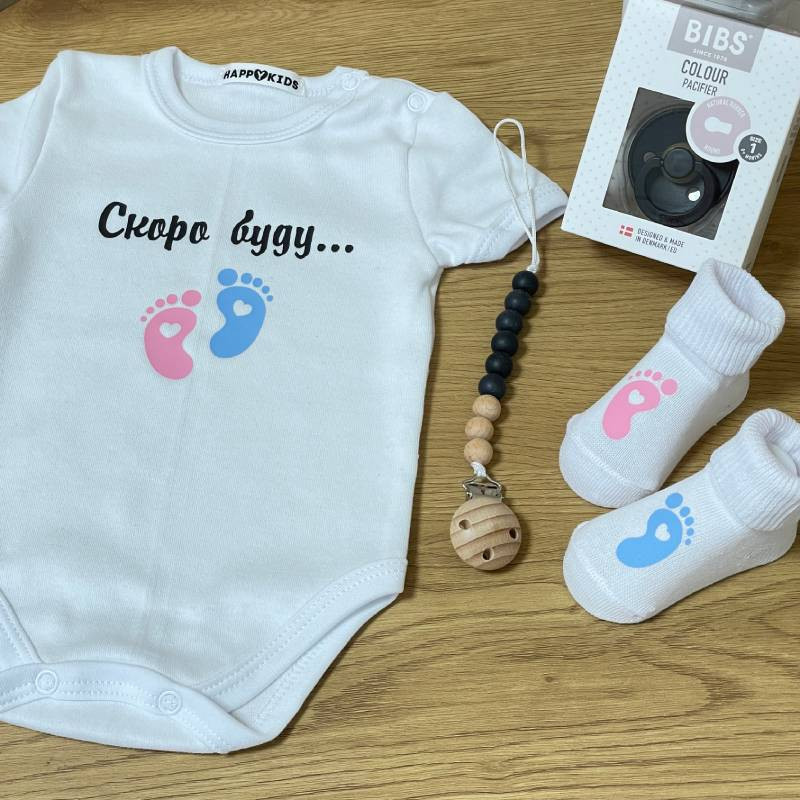 Підготуйтеся до нової життєвої подорожі з нашим ексклюзивним набором для вагітної! Цей набір включає все необхідне для того, щоб зробити очікування малюка комфортним та радісним. У нього входять боді з написом "Скоро буду", шкарпетки, пустушка та силіконовий тримач. Кожен елемент ретельно відібраний, щоб забезпечити максимальний комфорт та практичність.