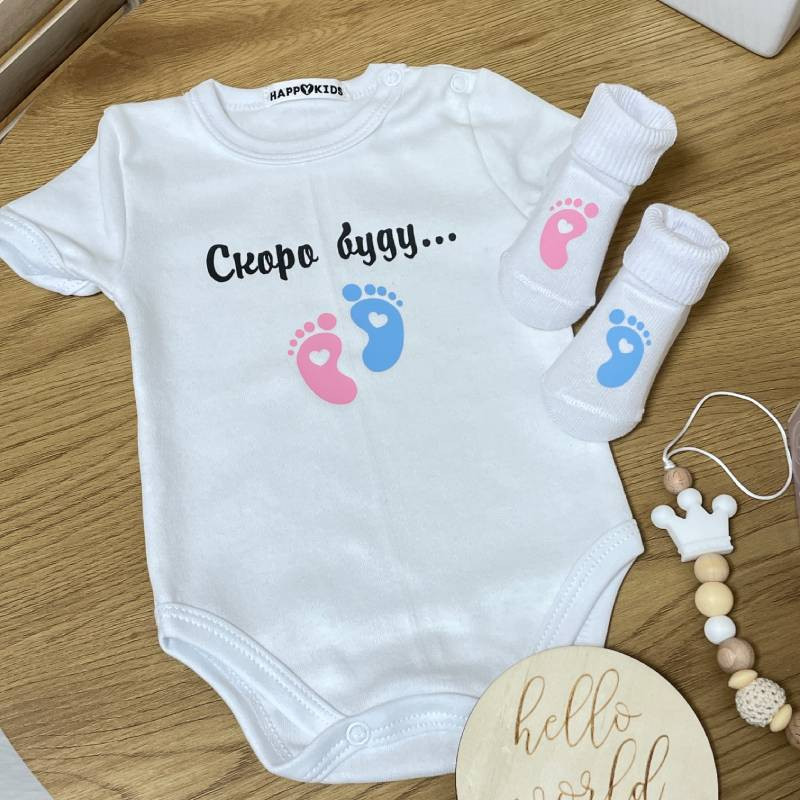 - Боді з написом "Скоро буду": Матеріал: 100% бавовна, білий з яскравим принтом. Легкий, дихаючий матеріал, приємний на дотик, зручний крій, який не обмежує рухів.