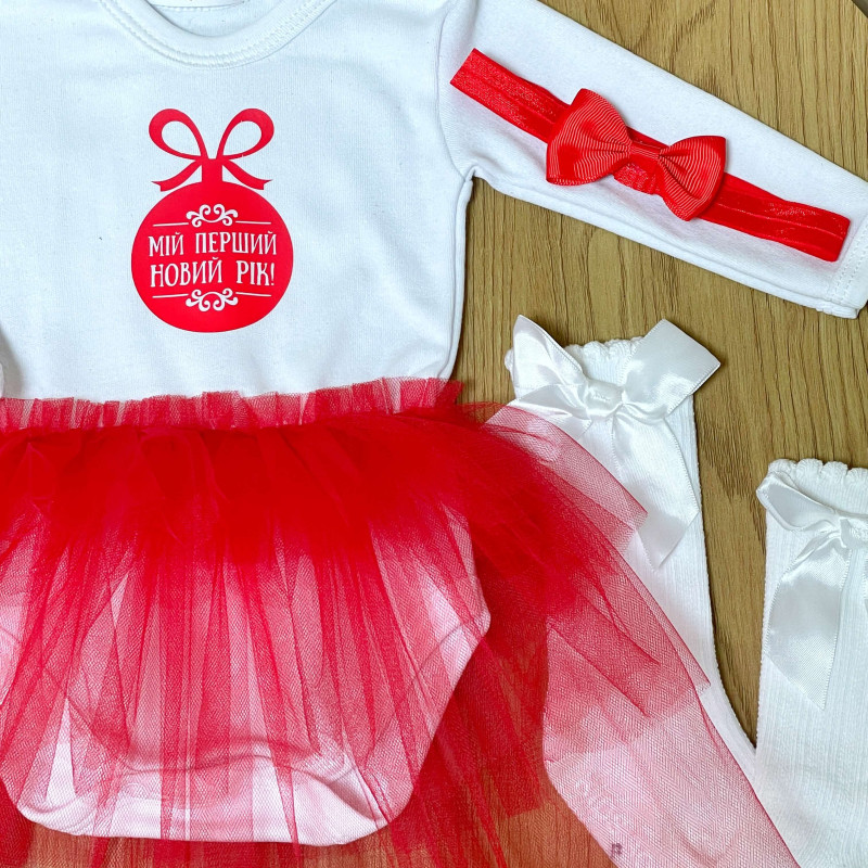 У наборі: боді зі спідничкою, гольфи з бантиком, маленький бантик.