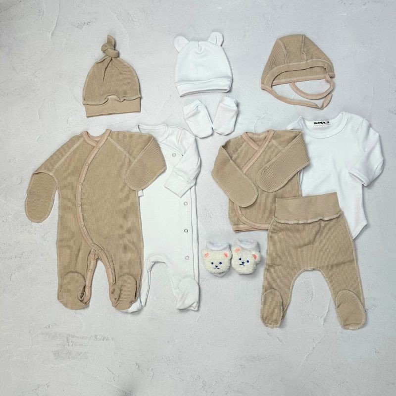 Набір одягу для новонароджених у бежево-білих відтінках – це чудове рішення для щоденного носіння, урочистих подій або як стильний подарунок для майбутніх батьків.