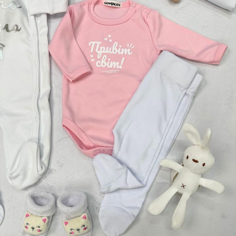 - Боді рожеве з написом "Привіт світ" повзунами та шапочкою з відворотом.