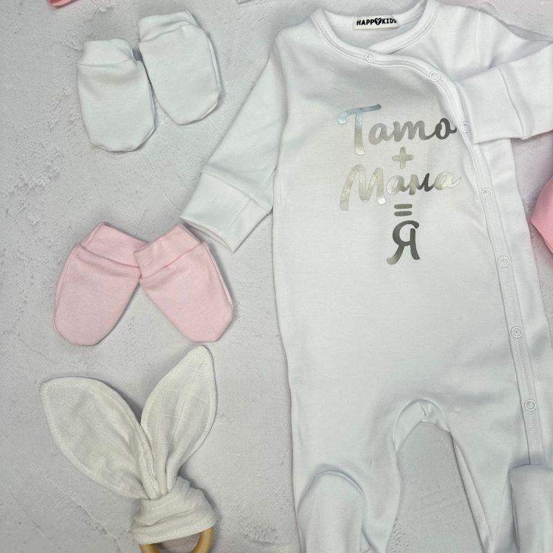 - Сліп з написом "Тато+мама" та шапочка з вушками із інтерлока преміум якості білого кольору.
