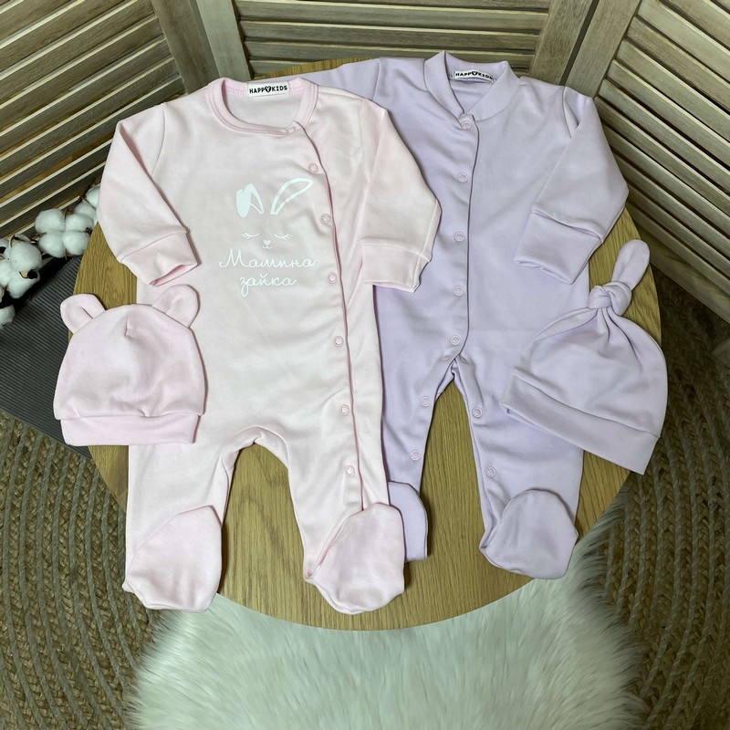 У наборі: рожевий сліп з написом "Мамина зайка" + шапочка в тон, бузковий сліп + шапочка в тон