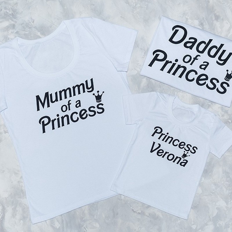 Комфортні футболки в одному стилі з написами для мами, тата, принцеси - найкращий вибір для всієї родини ідеально підходить одяг на перший день народження дитини. Також чудова ідея для сімейної фотосессії або родинного свята.