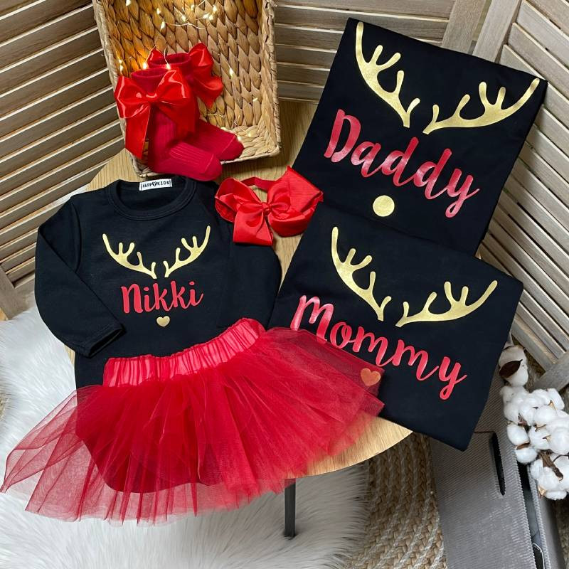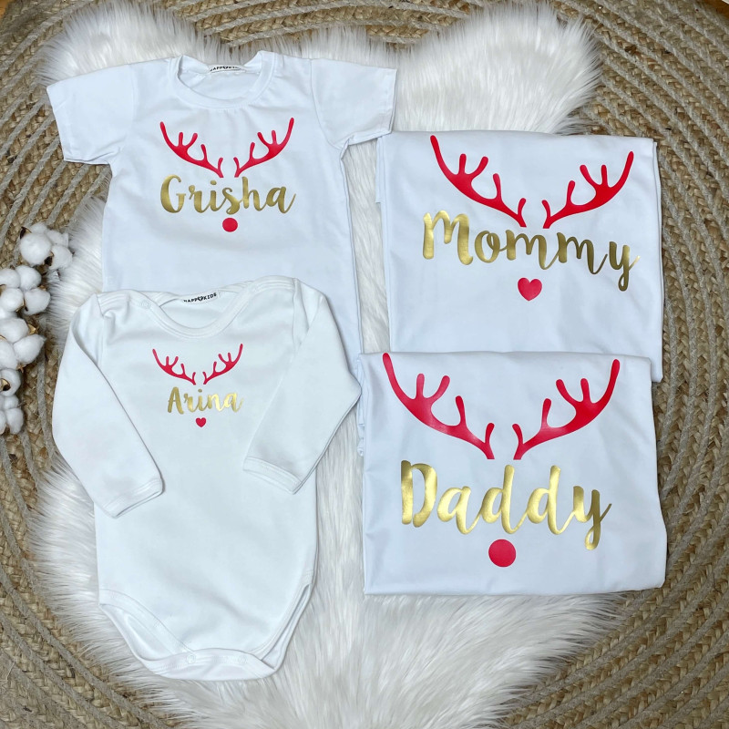 Новорічні футболки в одному стилі з оригінальним написом найкращий вибір для всієї родини ідеально підходить одяг на перший Новий рік дитини. Також чудова ідея для подарунку, сімейної фотосессії або новорічного родинного свята.