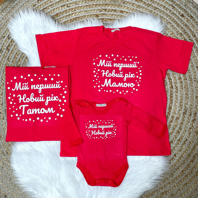 Новорічні футболки в одному стилі з оригінальним написом найкращий вибір для всієї родини ідеально підходить одяг на перший Новий рік дитини. Також чудова ідея для подарунку, сімейної фотосессії або новорічного родинного свята.