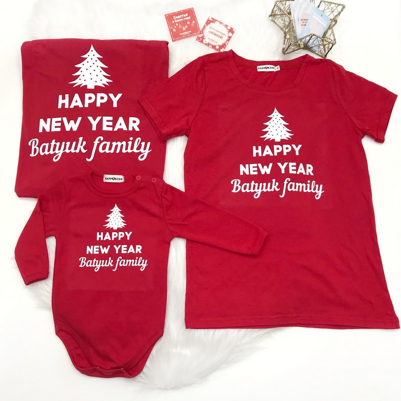 Набір сімейних новорічних футболок "Happy New year" іменний family червоний