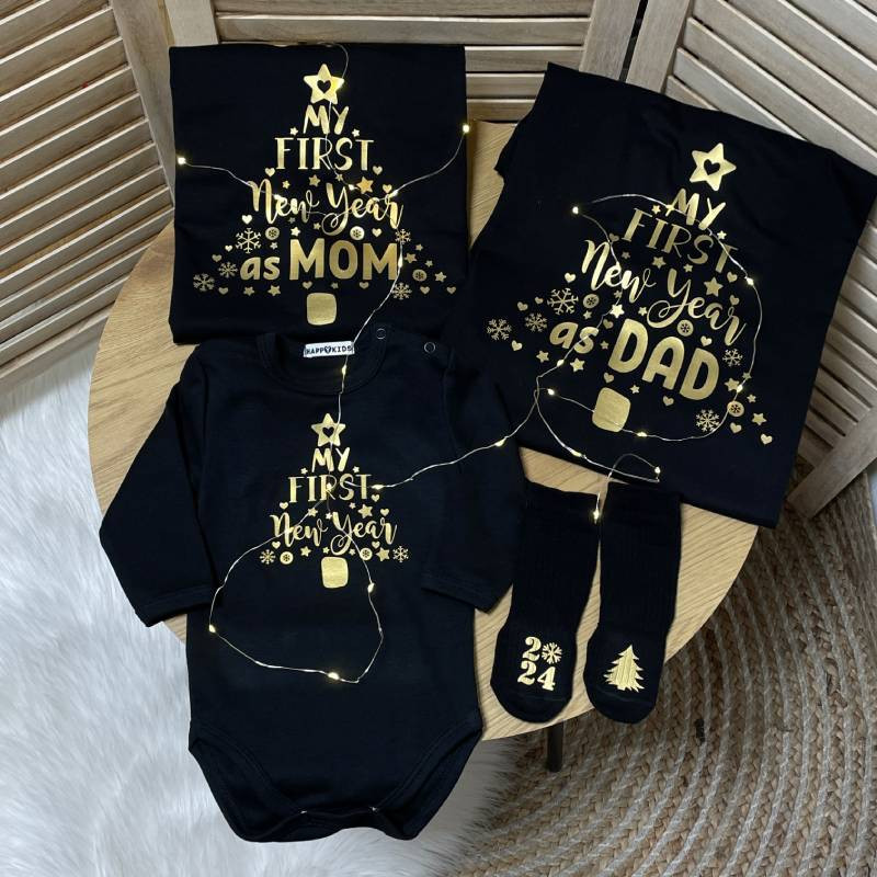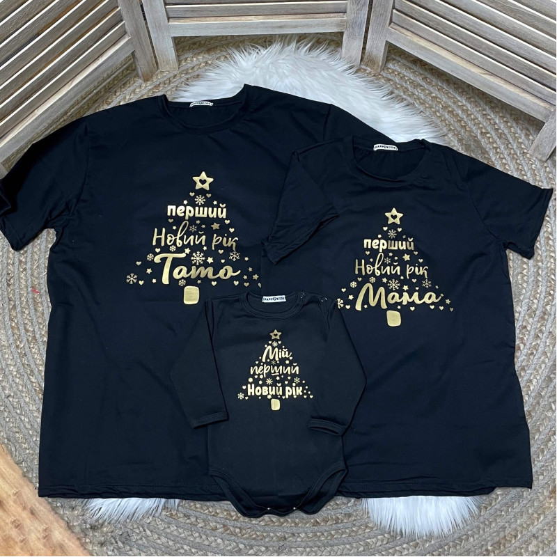Новорічні футболки в одному стилі з оригінальним написом найкращий вибір для всієї родини ідеально підходить одяг на перший Новий рік дитини. Також чудова ідея для подарунку, сімейної фотосессії або новорічного родинного свята.