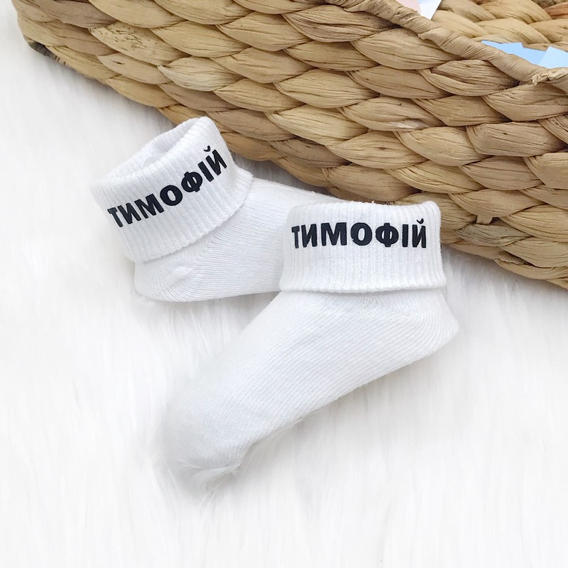 Шкарпетки бавовняні, м'яка еластична гумка не передавлює ніжку. Ім'я наноситься на замовлення індивідуально для кожного клієнта.