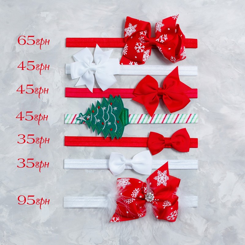 І для найменших діток, які святкують свій перший Різдво, ми пропонуємо найсолодший і наймиліший аксесуар - новорічні бантики на резинці для новонародженої від 0 до 1 року.