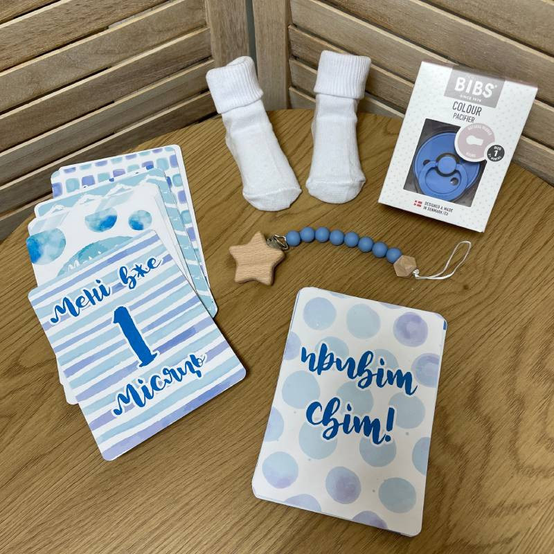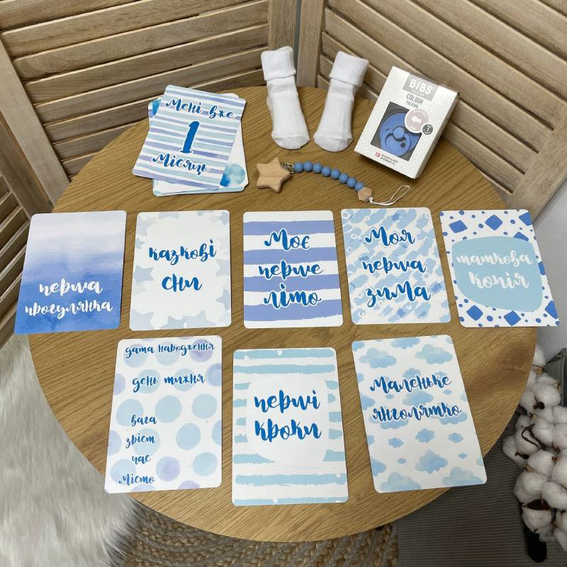 Подарунковий набір новонародженому з картками для фото блакитні акварель