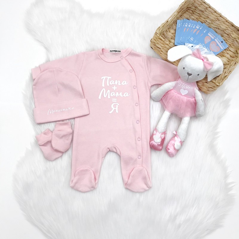 У наборі: сліп із написом, шапочка з ім'ям, подряпини, зайчик з ім'ям.