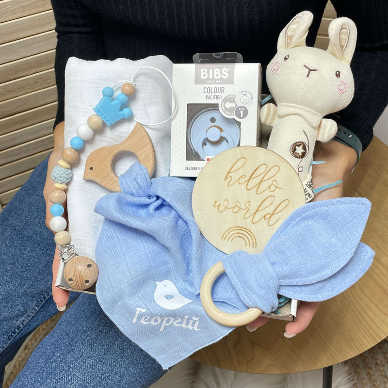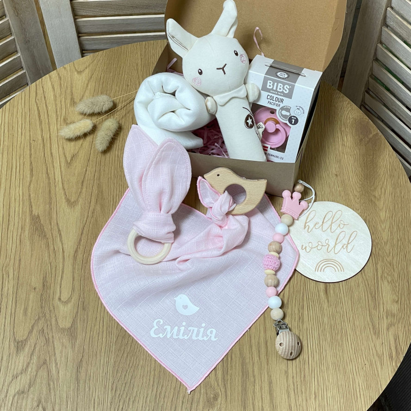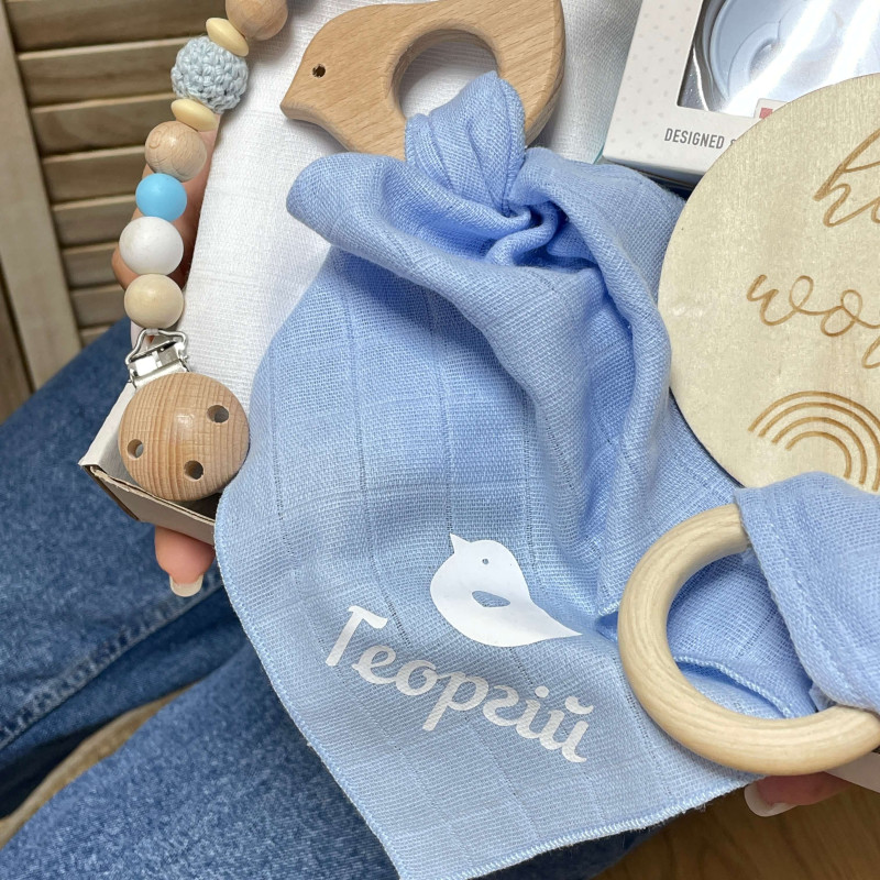 - Іменна хустинка з гризунцем-пташечкою: Особистий аксесуар з ім'ям малюка, який надає боксу особливого шарму.