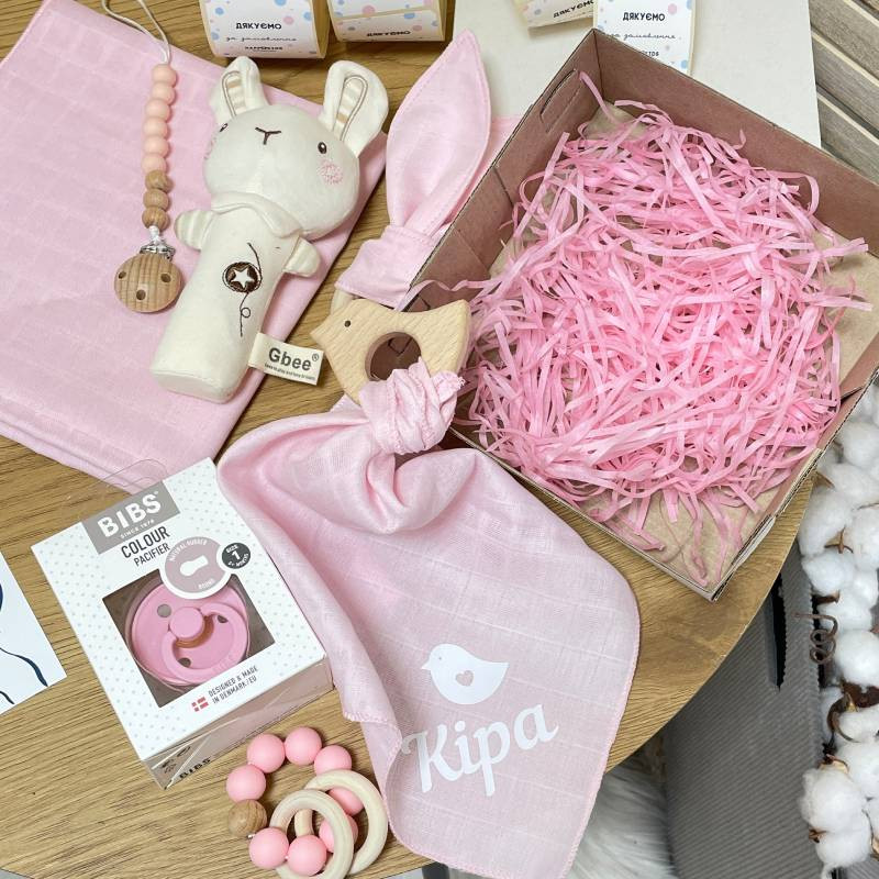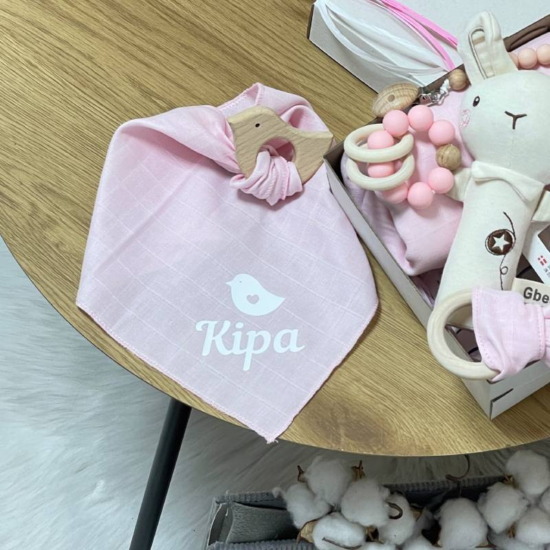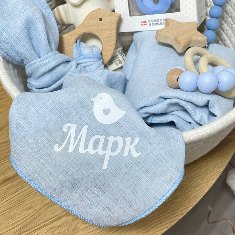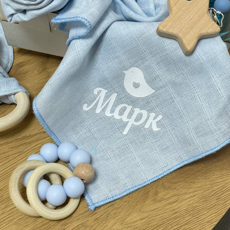 - Іменна хустинка з гризунцем-пташечкою: Особистий аксесуар з ім'ям малюка, який надає боксу особливого шарму.
