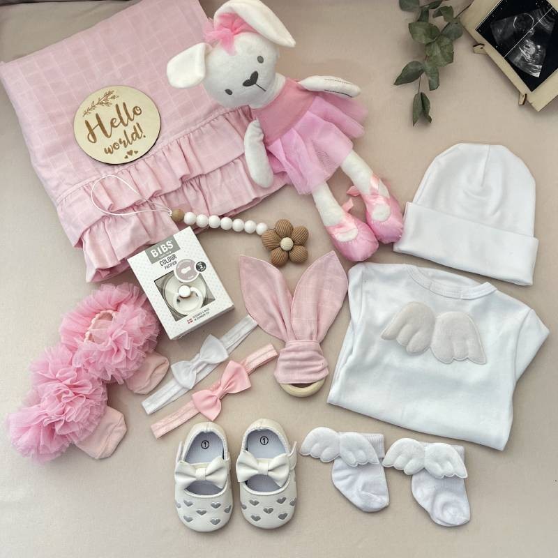 - Переваги: готовий подарунок на народження дівчинки, упаковка преміум-класу — не потребує додаткового оформлення, універсальний варіант на baby shower або gender party