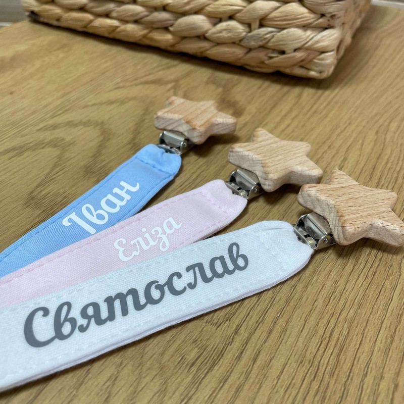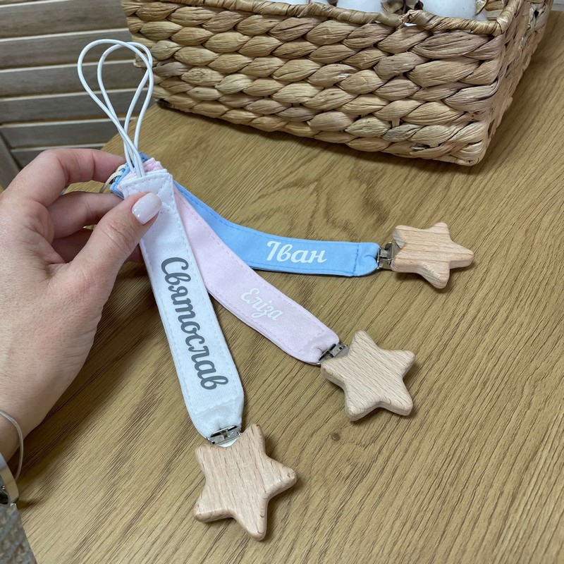 Доповни пустушку оригінальним тримачем з іменем дитини, він легко кріпиться до одягу дитини. Тримач для соски для новонароджених є однією з найбільш корисних речей для батьків. Він допомагає уникнути випадання соски під час прогулянок або сну дитини.