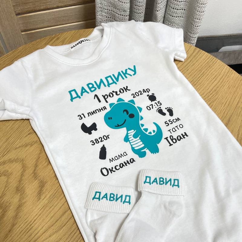 - Переваги: ідеальний образ на перший день народження, можливість персоналізації — метрика дитини, м’яка, безпечна тканина, зручна застібка для легкого переодягання