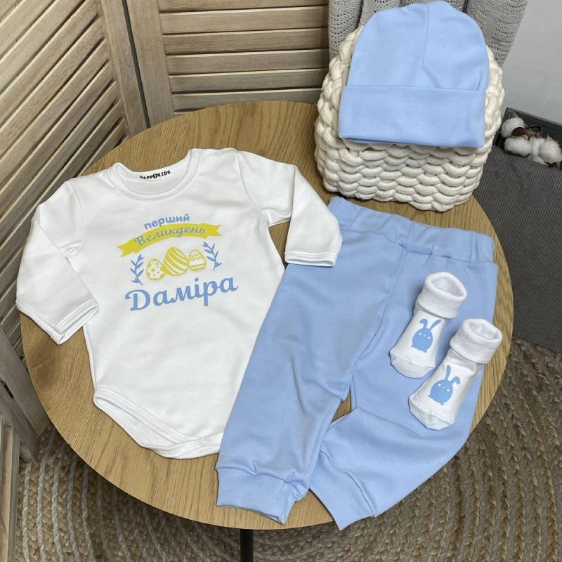 - Дизайн: тематический принт к празднику Пасхи и индивидуальное имя малыша.