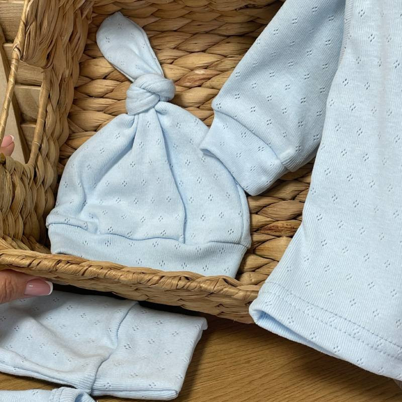 В комплекте: боди на кнопках, ползунки, кофточка, человечек и шапочка с узелком.