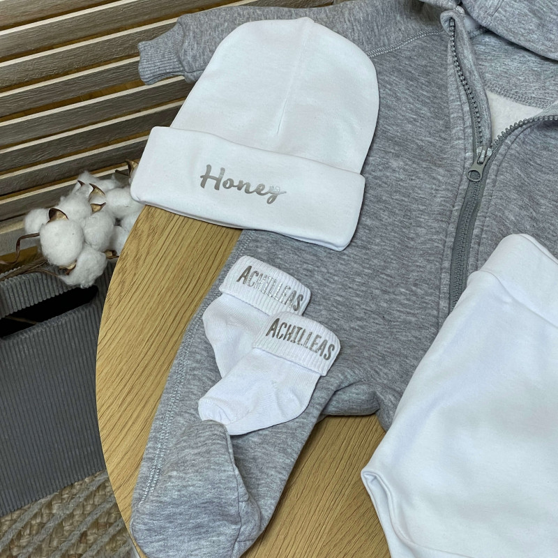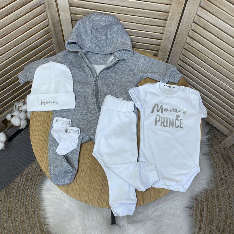 В наборе: Боди с надписью, штанишки, шапочка, носки, теплый комбинезон с капюшоном на молнии.