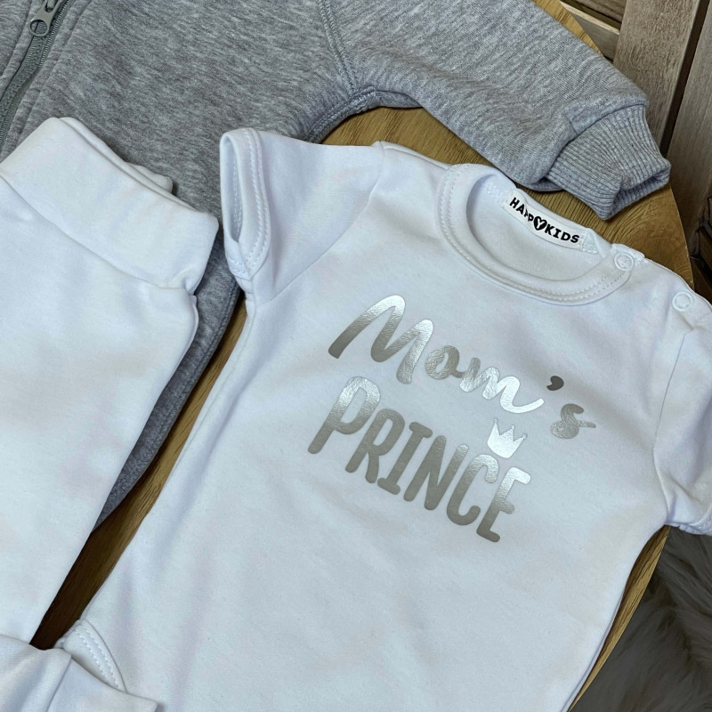 Комплект самой необходимой одежды для новорожденных с оригинальным принтом для мальчика. Стильный принт и прикольная надпись на боди и аксессуары, идеально дополняющие друг друга.