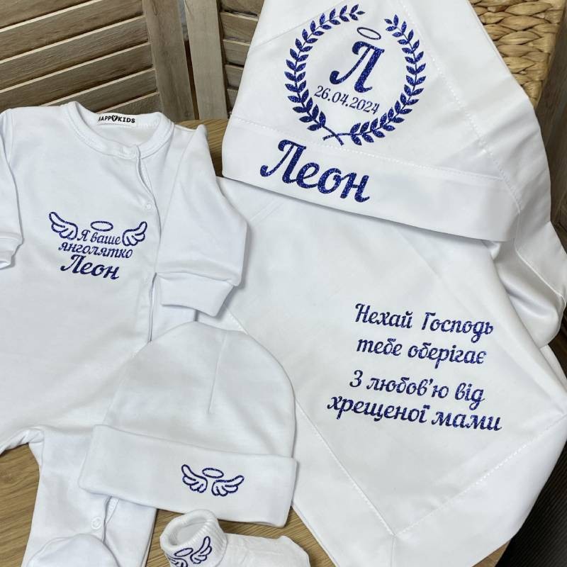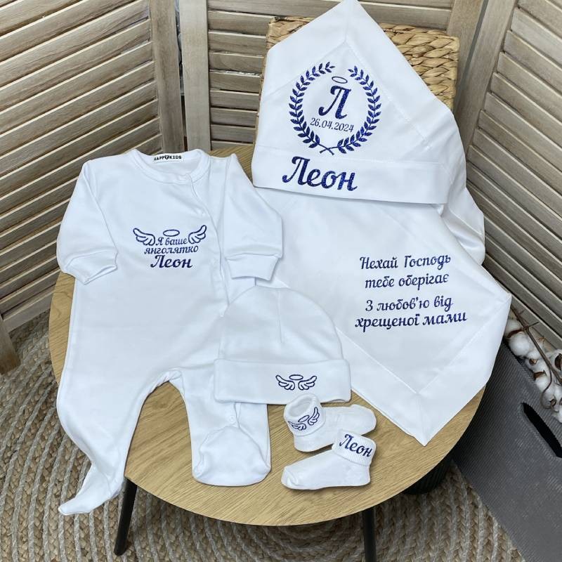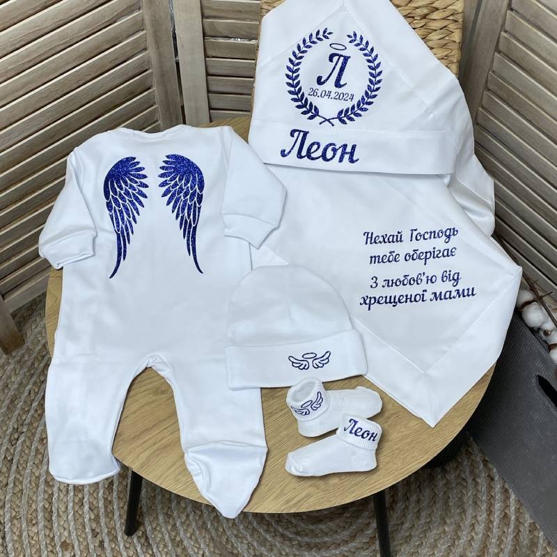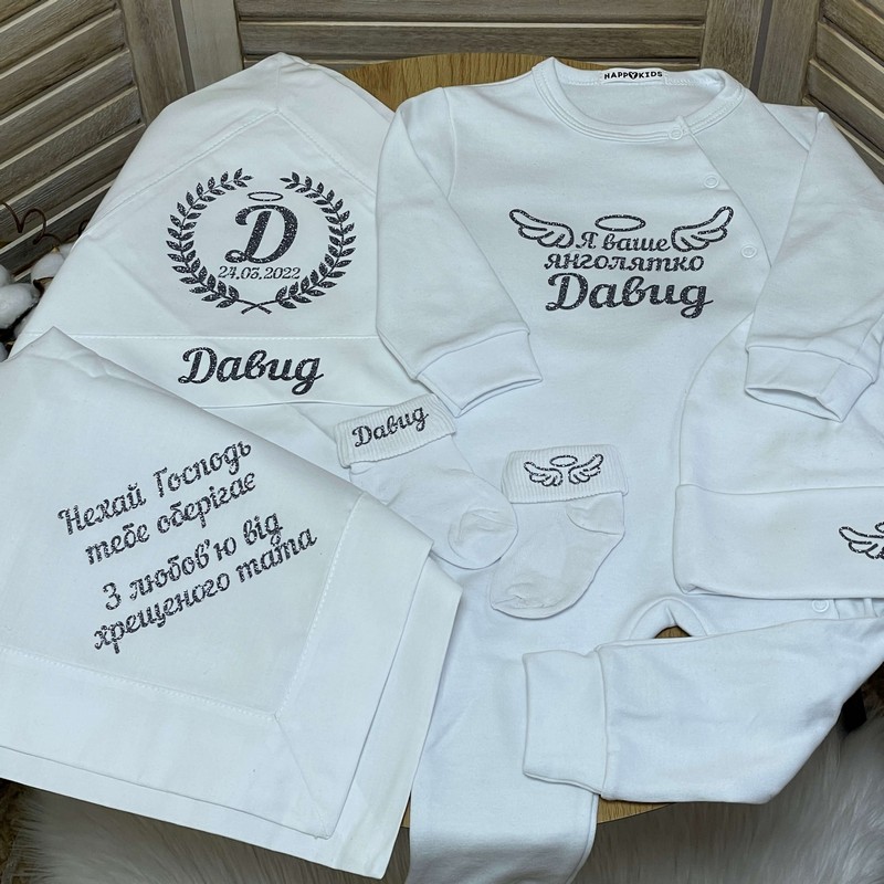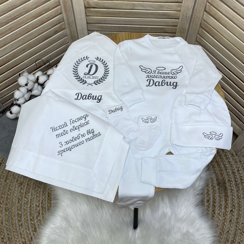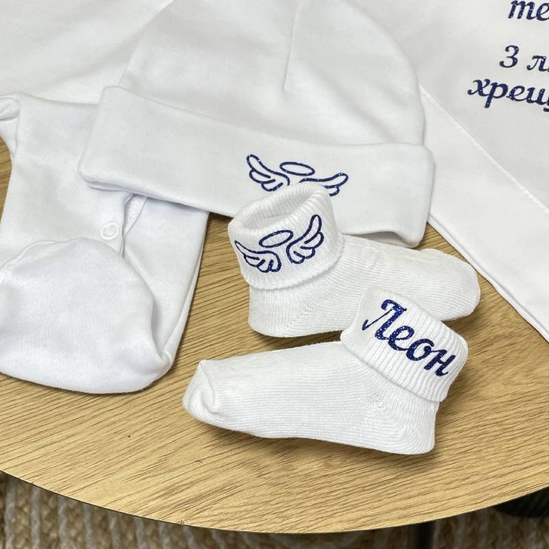 Этот крестильный набор именной, хорош как никакой другой во всех отношениях. Чего только стоит то, сколько предметов входит в комплект. Это комфортный человечек, теплые носочки, шапочка, и конечно же крыжма. При этом, каждый из них является именным. И мы можем предложить вам нанести на него любую надпись. Начиная от имени, и заканчивая поздравительными словами. Поэтому, такой крестильный набор способен не просто оправдать, но и превзойти все ваши ожидания.