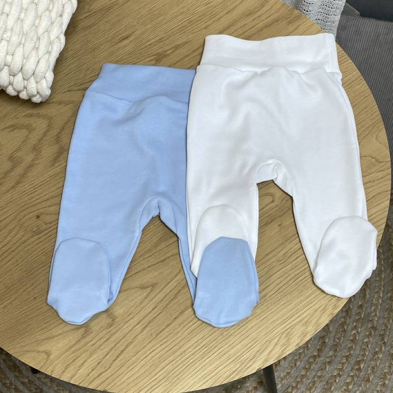 В комплекте два ползунка с высокой посадкой, мягким поясом и закрытыми ножками.