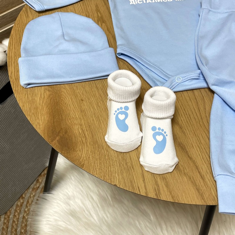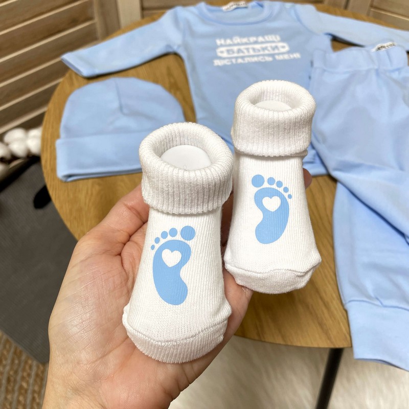 В наборе: Боди с надписью, штанишки, шапочка, носочки, однотонный слип с шапочкой в тон.