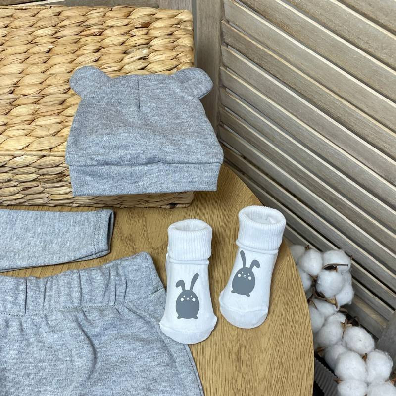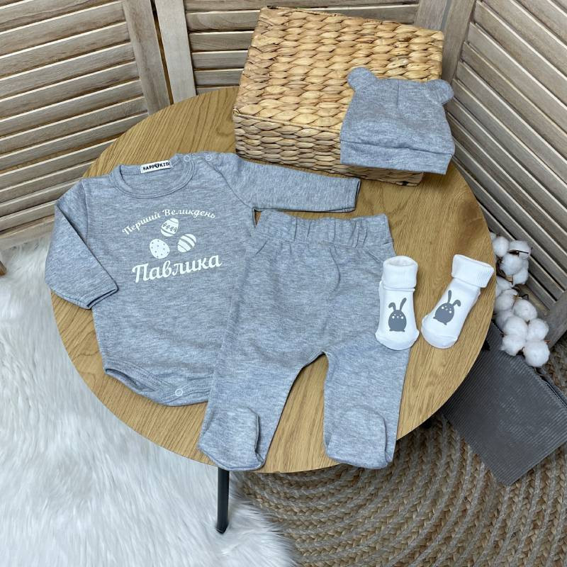 Наш набор для новорожденных включает самые сладкие вещи с праздничным настроением и личным торком. Каждый предмет изготовлен из мягкого и дышащего материала, чтобы обеспечить комфорт вашему малышу. Главной чертой этого комплекта является нанесение имени вашего ребенка и замечательной надписи "Первая Пасха", что дает вам возможность сохранить этот специальный момент навсегда.