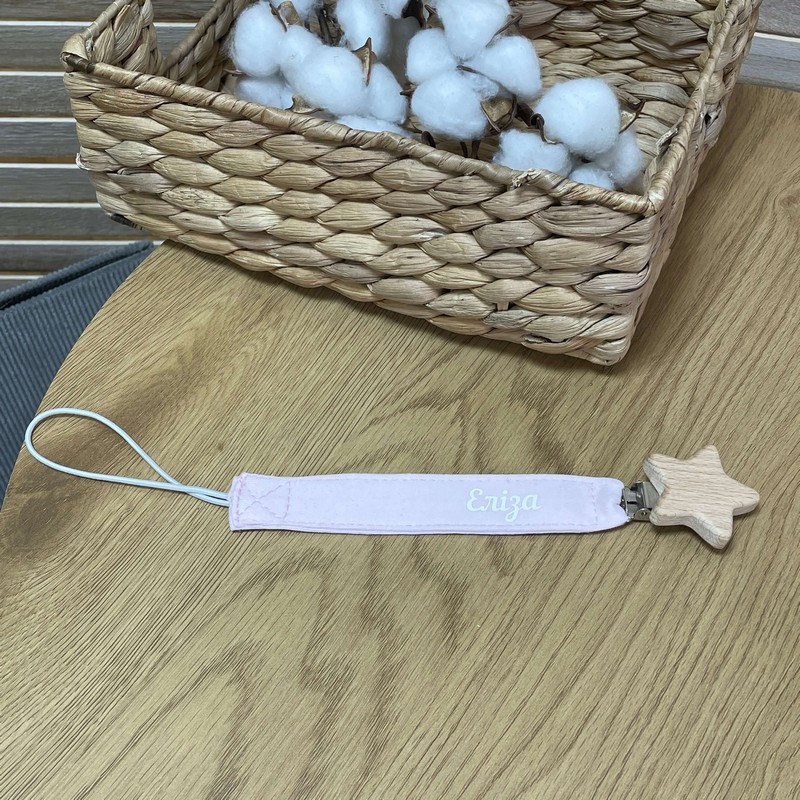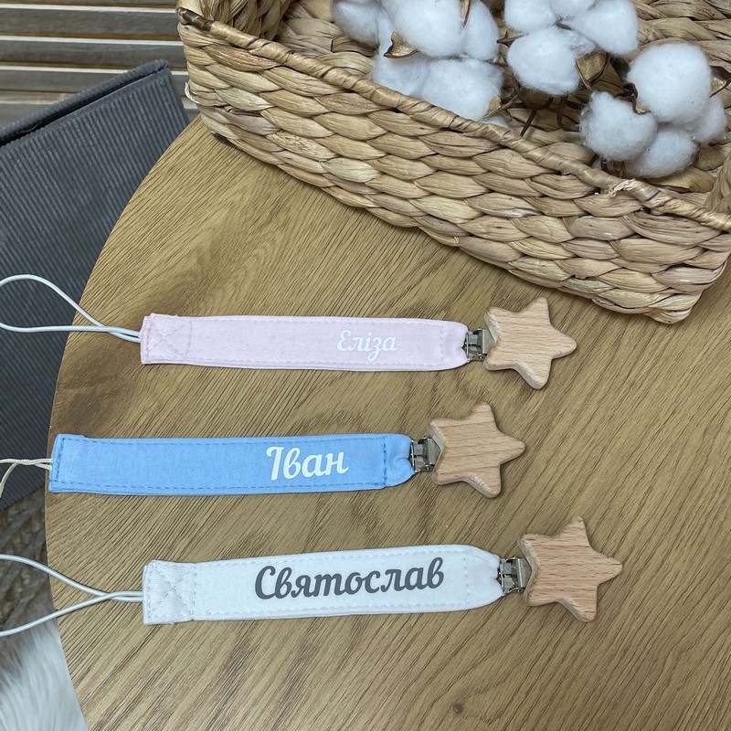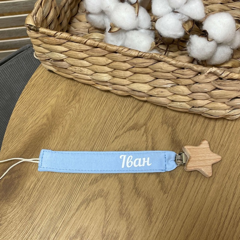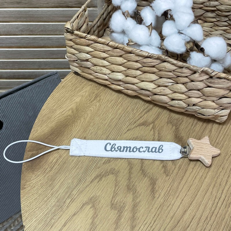 Наш іменний тримач для соски - це ідеальний аксесуар для новонароджених, який допоможе зберегти соску завжди в безпеці і порядку. Виготовлений з дерев'яного тримача з тканевою основою, він зручний для дитини та забезпечує максимальний комфорт.