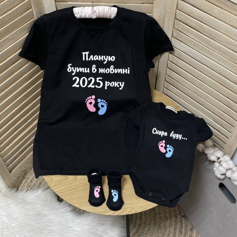 - Практичність – футболку можна носити під час вагітності та після пологів, а боді – ідеальний для перших днів життя малюка.